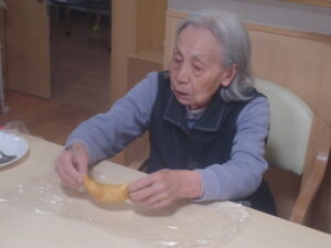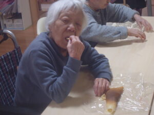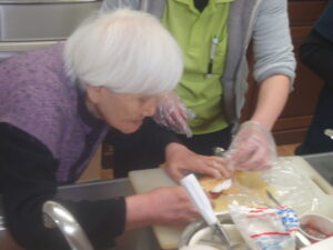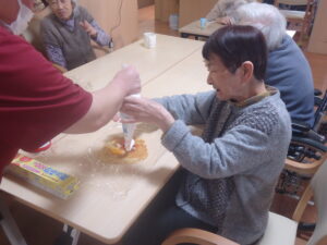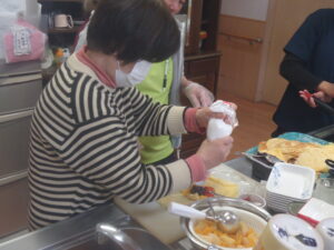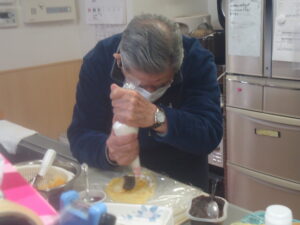そんな中、先日、クレープロール作りを行いました。クレープの生地を作り、そのクレープの上にクリームなど好きな具材をトッピングしました。